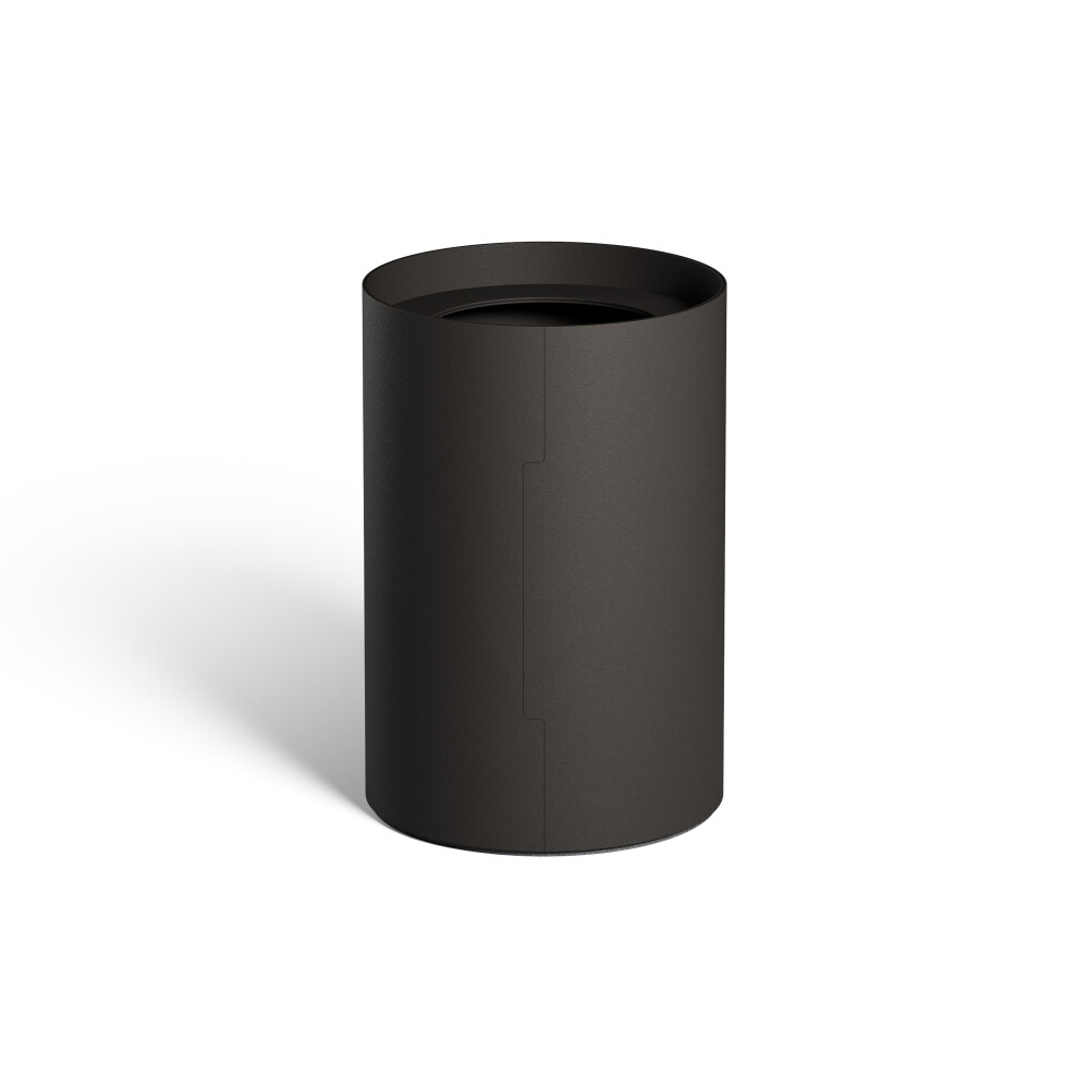 Drei TIDY Papierkörbe in Schwarz, Dunkelgrün und Ocker mit runder Öffnung, von oben fotografiert.