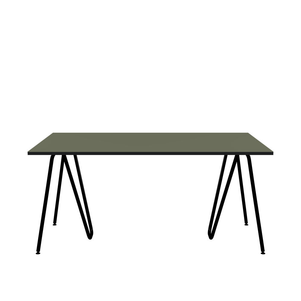 SINUS Table - Shape Square - Length 160.00 cm - Width 100.00 cm - Radius 0.30 cm - Thickness 2.1 cm - Surface Linoleum, 4184 Olive - Core MDF - Edge MDF, Black - Profile Edge 90° / SINUS Trestles - Material and Colour Steel, Powder-coated, Jet black (RAL 9005) - Size L: L 74 × W 36 × H 72 cm