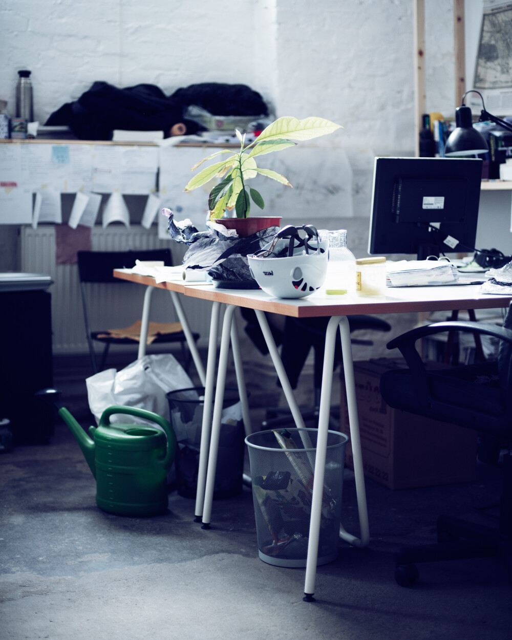 White lacquered Sinus table trestles by Daniel Lorch as table frames in a creative studio with work materials.